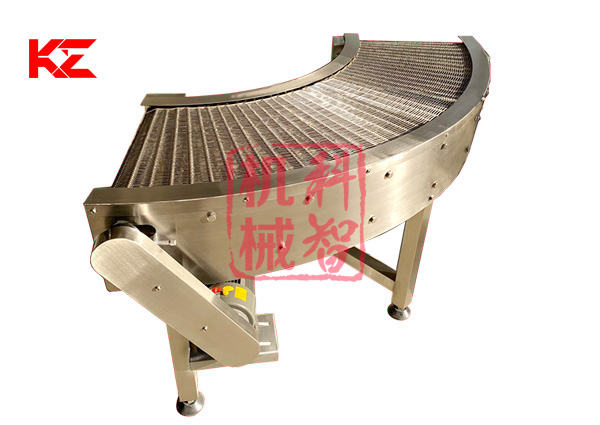 轉彎輸送機采用的形式有:網帶轉彎輸送機、鏈板式轉彎輸送機、皮帶式轉彎輸送機、鏈桿式轉彎輸送機、塑料模塊式轉彎輸送機等。轉彎角度有45度、90度、180度等等。轉彎食品輸送機的寬度和轉彎半徑均可根據需求定做。